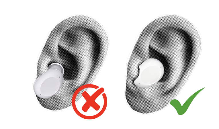 Kuulokkeet ovat oikein korvassa, kun kuulokkeiden kärki osoittaa korvalehteä kohti ja näyttää uppoavan korvaan. Mikäli kuuloke on liian syvällä korvassa, ja mikrofonireiät osuvat ihon pintaan, yhteys häiriintyy.
