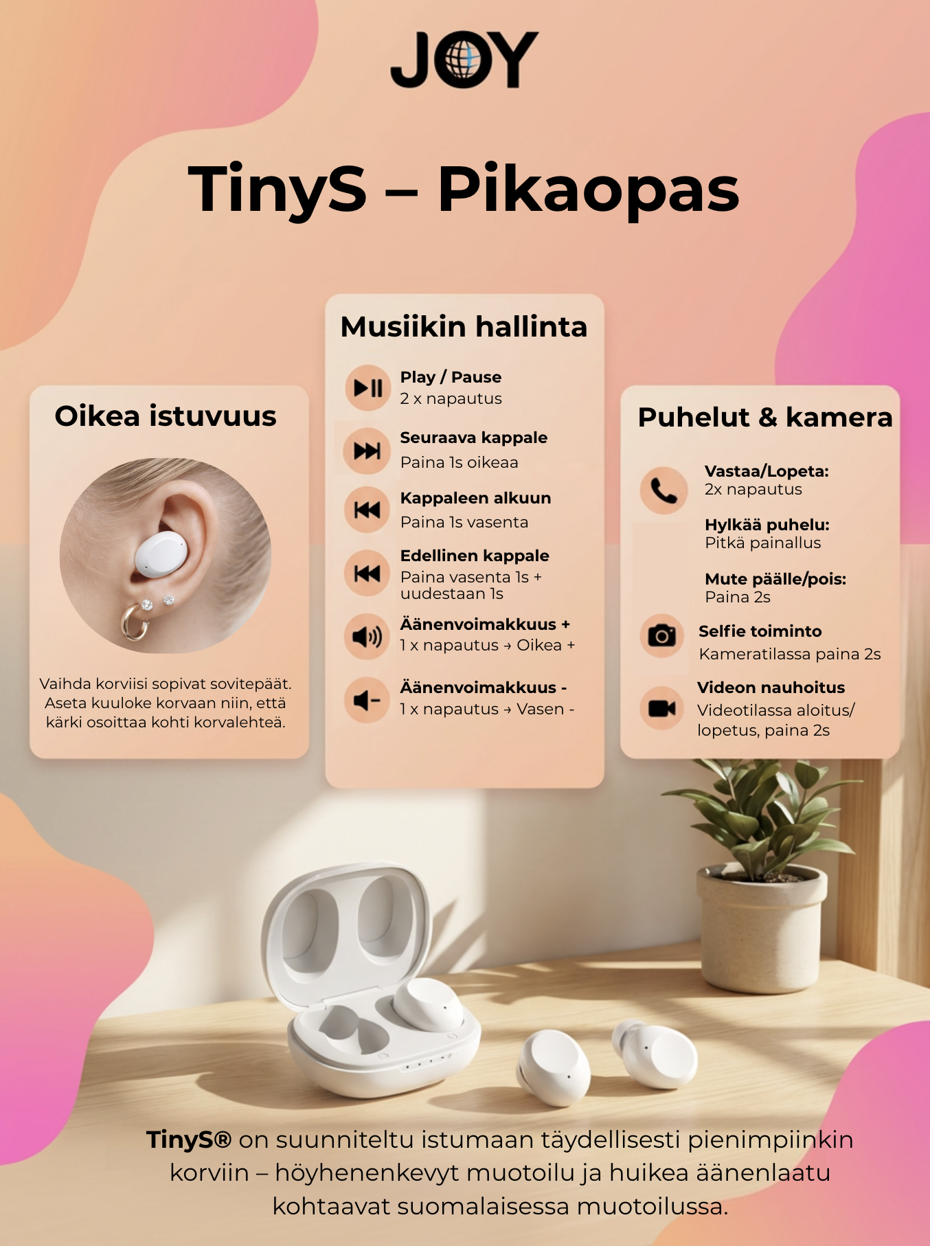 Ota kuulokkeet ulos latausboksista, niin ne muodostavat automaattisesti parin keskenään. Sitten voit avata Bluetoothin esim. matkapuhelimellasi ja etsiä 'JOY TinyS for you' yhteyden muodostamista varten.
